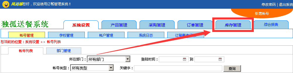 进入系统后点击【库存管理】,请看下图箭头指向的地方: