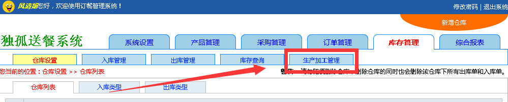 进入库存管理模块后点击【生产加工管理 】链接,请看下图箭头指向的地方: