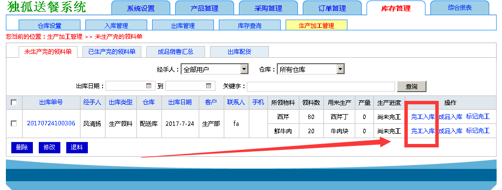 进入【未生产完的领料单】页面后,找到对应的领料单相,然后点击领料单右边对应的【完工入库】链接,请看下图箭头指向的地方: