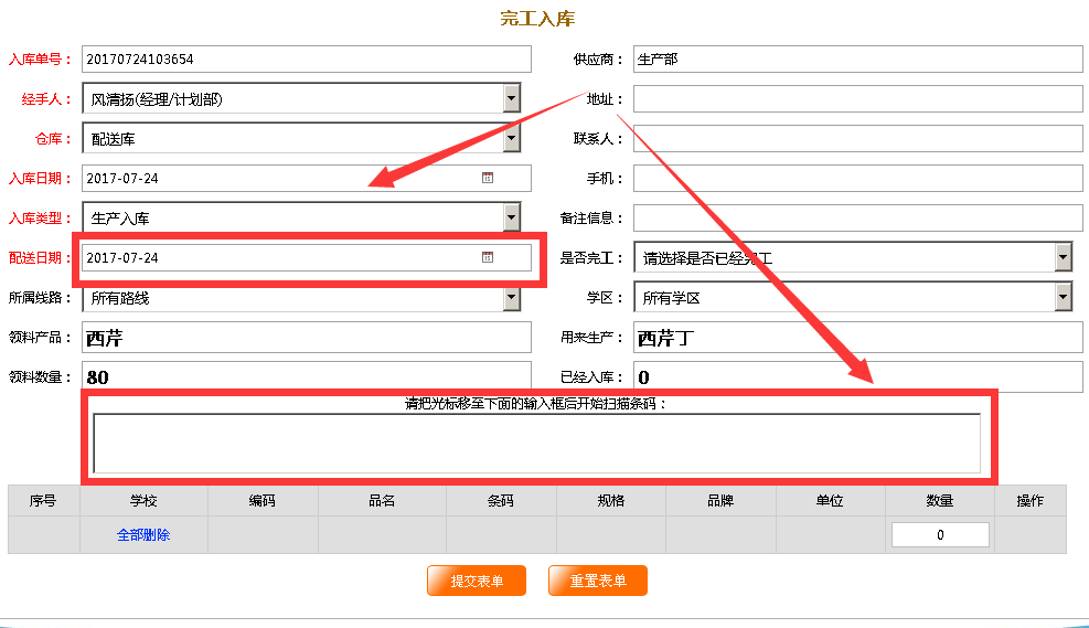 进入扫描页,请先选择配送日期,然后把光标移到找描框中开始扫描,请看下图箭头指向的地方: